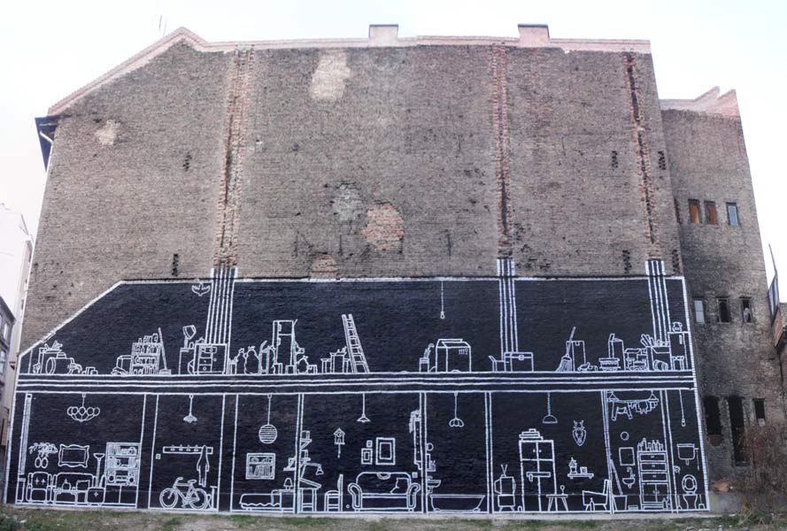 "We live in Budapest, Hungary. The project was made in the 8th district, in an area of suspicoius reconstructions. Beautiful old buildings are demolished for replacing them with new ugly buildings made of cheap and bad materials. The idea was to create a memorial painting of a demolished building. There are many empty houses and giant firewalls around, so it wasn't hard to select.